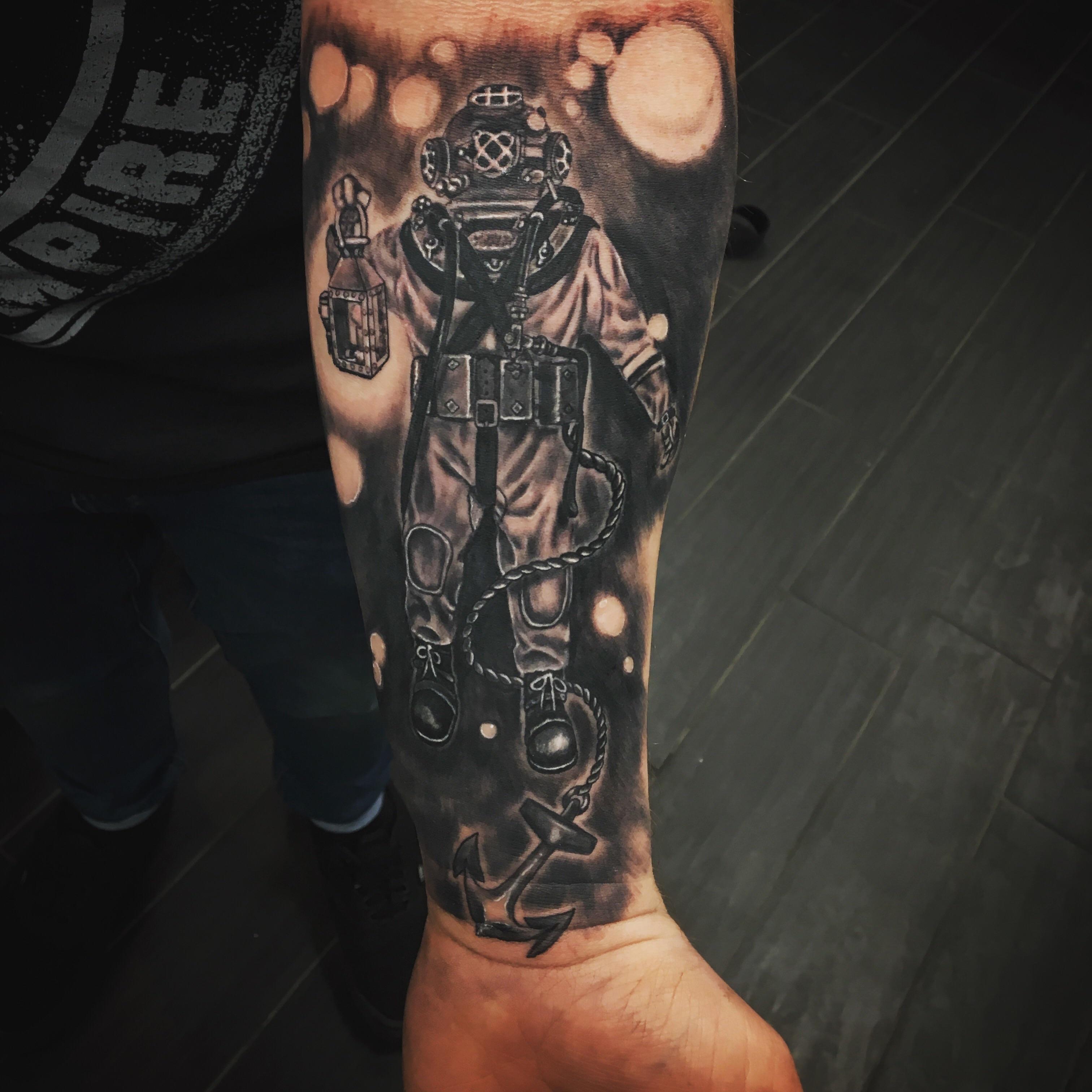 Matt Added A Deep Sea Diver And Octopus To This Arm By 2 Dot Crew Tattoo Facebook